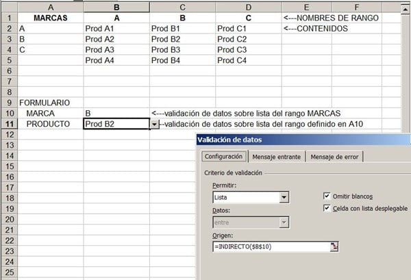 Tengo en la columna A, una lista desplegable con diferentes marcas de productos, quisiera saber, como puedo hacer para que al elegir por ejemplo la marca A, salga en un campo de texto todos los productos de la marca A, y así al seleccionar las diferentes marcas (B, C, D..)