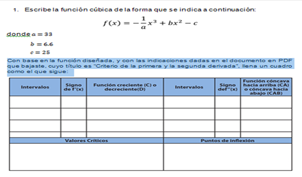 $$\begin{align}&f(x)= -\frac 1{33}x^3+6.6x^2-25\\&\\&f'(x)=-\frac 1{11}x^2+13.2x\\&\\&f''(x) =-\frac 2{11}x+13.2\\&\\&\text{Los valores críticos son:}\\&\\&-\frac 1{11}x^2+13.2x=0\\&\\&x_1=0\\&\\&-\frac{x}{11}+13.2=0\\&\\&x_2=11·13.2= 145.2\\&\\&\\&\text{Y la raíz de }f''(x) \\&\\&-\frac 2{11}x+13.2=0\\&\\&x_3=\frac{13.2·11}{2}=72.6\end{align}$$Los signos los calculo de esta forma f'(x) es polinomio de grado 2 con coeficiente director negativo.  Entonces en -infinito el límite es - infinito, luego el signo es negativo, luego pasa a positivo tras la primera raíz ya negativo tras la segunda.