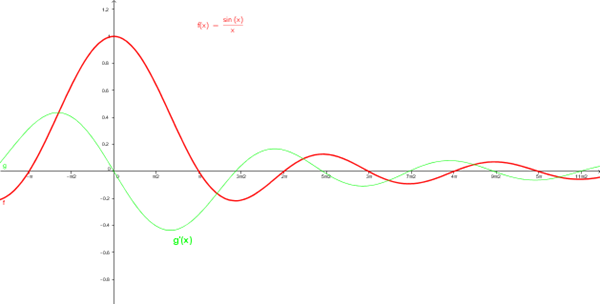 $$\begin{align}&f'(0)=\lim_{h\to0}\frac{f(0+h)-f(0)}{h}=\\&\\&\\&\lim_{h\to 0}\frac{\frac {senh}h-1}{h}=\lim_{h\to 0}\frac{senh-h}{h^2}=\\&\\&\text{el desarrollo de Taylor de la función seno es}\\&\\&sen h=h-\frac{h^3}{3!}+ o(h^5)\\&\\&=\lim_{h\to 0}\frac{h-\frac{h^3}{3!}+ o(h^5)-h}{h^2}=\\&\\&=\lim_{h\to 0}\frac{\frac{h^3}{3!}+ o(h^5)}{h^2}=\\&\\&\frac{h}{3!}+o(h^3)=0+0=0\end{align}$$Yo creo que también habria que calcular la derivada segunda en el 0 ya que la función esta indefinida en ella.