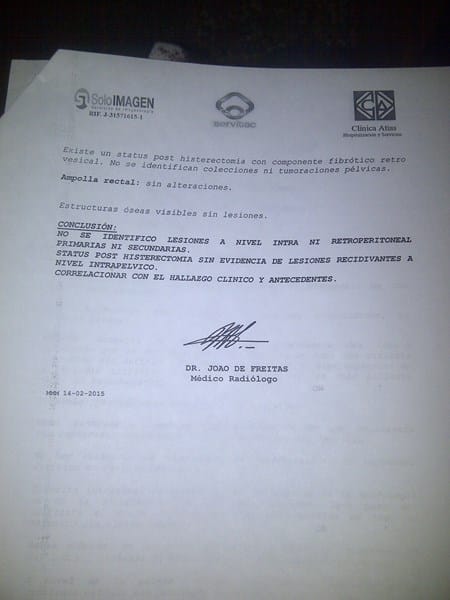 Doctor la presente es para comentarle un resumen de mi salud. En Febrero del Año pasado fui operada de C.A de cuello uterino en estadio 1B1 comencé con 5 Quimios en mayo y 32 radios incluyendo 3 implantes vaginales los cuales culmine en septiembre del ano pasado