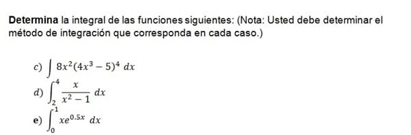 $$\begin{align}&c)\quad\int 8x^2(4x^3-5)^4dx=\\&\\&t=4x^3-5\\&dt=12x^2dx \implies x^2dx= \frac {1}{12}dt\\&\\&=8·\frac 1{12}\int t^4dt=\\&\\&=\frac 23·\frac{t^5}{5}+C =\frac{2(4x^3-5)^5}{15}+C\\&\\&\\&\\&d) \quad \int_2^4 \frac{x}{x^2-1}dx=\\&\\&t=x^2-1\\&dt=2x dx\implies xdx=\frac 12 dt\\&x=2\implies t=3\\&x=4\implies t=15\\&\\&=\frac 12\int_{3} ^{15}\frac {dt}{t}=\\&\\&\left.\frac 12 lnt\right|_3^{15}=\frac{ln15-ln3}{2}\\&\\&\\&\\&e)\quad \int xe^{0.5x}dx =\\&\\&\text{esta se hace por partes}\int udv=uv-\int vdu\\&u=x \quad\quad\quad\quad du=dx\\&dv=e^{0.5x}dx \quad v=2e^{0.5x}\\&\\&= 2xe^{0.5x}|_0^1-\int_0^1 2e^{0.5x}dx=\\&\\&2e^{0.5}-0 -\left[4e^{0.5x} \right]_0^1 =\\&\\&2e^{0.5}-4e^{0.5}+4e^0=4-2e^{0.5}\end{align}$$
