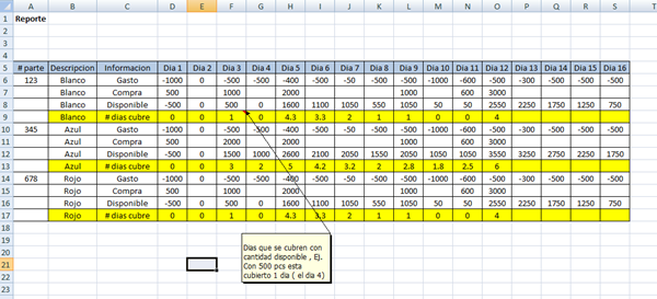 Me pudieras apoyar para desarrollar una macro que me determine el numero de días que tengo cubiertos en base a lo que tengo disponible. Por Ej. En el día 3 tengo cubierto el día 4 con lo que tengo disponible,( o sea 1 día) y así sucesivamente.