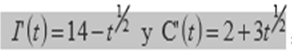 $$\begin{align}&I'(t) = 14-t^{1/2}\\&I(t) = \int(14-t^{1/2})\;dt = 14t-{t^{3/2}\over{3\over2}}+K_1\\&I(t) = 14t-{2t^{3/2}\over3}+K_1\\&\\&C'(t) = 2+3t^{1/2}\\&C(t) = \int(2+3t^{1/2})\;dt = 2t+{3t^{3/2}\over{3\over2}}+K_2\\&C(t) = 2t+2t^{3/2}+K_2\\&\end{align}$$