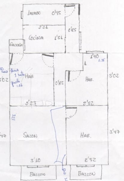 Mas adelante pondré una puerta corredera en el ultimo pasillo tocando a la cocina, para así no perder aire. El piso hace 49m, pero lo que pretendo enfriar son las habitaciones y el salón.
