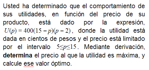 Mediante derivación, determina el precio al que la utilidad es máxima, y calcule ese valor óptimo.