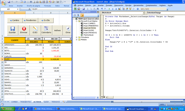Tengo esta planilla y este código que al mover el cursor para arriba o para abaja acompaña el color necesito agregar al código que cuando en la columna A aparece la palabra EFECTIVO quede la fila de A hasta F de otro color que yo elija en forma permanente unicamente esa fila que dice EFECTIVO
