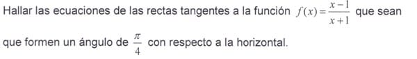 $$\begin{align}&y=\frac{x-1}{x+1}\\&\\&y'=\frac{1(x+1)-1(x-1)}{(x+1)^2}=\frac{2}{(x+1)^2}\\&\\&y'=1 \Rightarrow \frac{2}{(x+1)^2}=1 \Rightarrow 2=(x+1)^2\\&\\&Dos\ soluciones:\\&x+1=\sqrt 2\\&x+1=- \sqrt 2 \\&\\&De \ x+1= \sqrt 2 \Rightarrow x=\sqrt 2 -1 \Rightarrow \\&f(\sqrt 2 -1)=\frac{\sqrt 2-1-1}{\sqrt 2 -1+1}=\frac{\sqrt 2-2}{\sqrt 2}=racionalizando=\\&\\&\frac{\sqrt 2-2}{\sqrt 2}·\frac{\sqrt 2}{\sqrt 2}=\frac{2-2 \sqrt 2}{2}=1-\sqrt 2\\&punto Tangencia_1\\&T=(\sqrt 2-1,1- \sqrt 2)\\&recta \ tangente_1:\\&y-(1-\sqrt 2)=1(x- \sqrt 2 +1)\\&\\&Punto \ Tangencia_2\\&x=-1-\sqrt 2\\&f(-1- \sqrt 2)=\frac{-1-\sqrt 2 -1}{-1+\sqrt 2+1}=\frac{-2-\sqrt 2}{-\sqrt 2}=\frac{2+\sqrt 2}{\sqrt 2}=\\&racionalizando\\&\frac{2+\sqrt 2}{\sqrt 2}·\frac{\sqrt 2}{\sqrt 2}=\frac{2 \sqrt 2 +2}{2}=\sqrt 2 +1\\&\\&T_2(-1-\sqrt 2 , \sqrt 2 +1)\\&Recta \ Tangente_2:\\&\\&y-(\sqrt 2 +1)=1(x+1+ \sqrt 2)\\&\\&\end{align}$$Espero que te sirva y que lo hayas entendido. Si no pregúntame