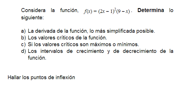 Considera la función, f(x)=(2x-1)^2(9-x). Determina lo siguiente: