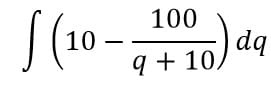 $$\begin{align}&\int(10 - {100 \over q+10})\ dq = \int 10\ dq- \int {100 \over q+10}\ dq = \\&= 10q - 100 \ln |q+10| + C\end{align}$$