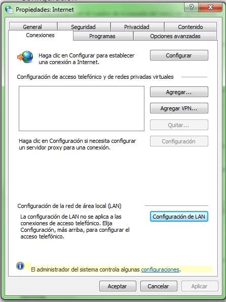 te agradezco tu respuesta, el problema es que eso ya lo intente y esta inhabilitada esa opción, te explico, cuando abro Herramientas > Opciones de Internet, en la pestaña Conexiones tiene un mensaje en la parte inferior de la ventana que dice que algunas opciones las controla el administrador del sistema y cuando entro a Configuración de Lan no esta habilitada la opción de cambiar el proxy. Ojalá puedas ayudarme. Gracias!