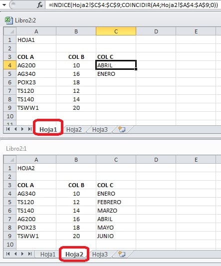 Necesito comparar entre la columna A de la hoja 1 y la Columna A de la hoja dos y traaer como resultado desde la hoja 2 columna C a la columna C de la hoja 1..