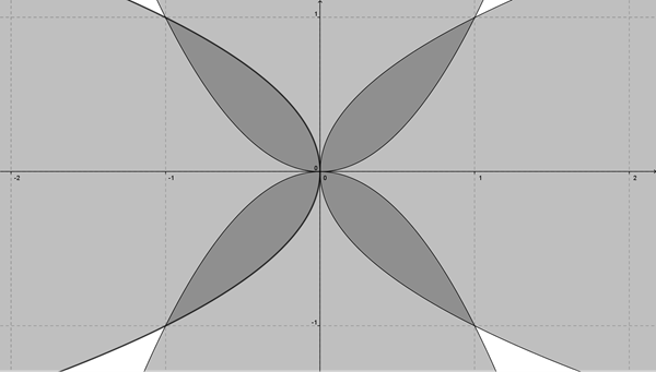 $$\begin{align}&ax^2=\sqrt{ \frac xa}\\&\\&a^2x^4 =\frac xa\\&\\&\text{la solución x=0 no es la que buscamos}\\&\\&a^2x^3 = \frac 1a\\&\\&x^3= \frac{1}{a^3}\\&\\&x= \frac 1a\\&\\&\text{luego el área será}\\&\\&A=4\int_0^{\frac 1a}\left(\sqrt{\frac xa}-ax^2\right)dx=\\&\\&4\int_0^{\frac 1a}\left(\frac 1{\sqrt a}·x^{1/2}-ax^2\right)dx=\\&\\&4\left[\frac 1{\sqrt a}\frac {x^{3/2}}{\frac 32}-a·\frac{x^3}{3} \right]_0^{\frac 1a}=\\&\\&4\left[\frac 2{3 \;\sqrt a}x^{3/2}-\frac a3 x^3 \right]_0^{\frac 1a}=\\&\\&4\left(\frac 2{3 \;\sqrt a}·\frac{1}{\sqrt{a^3}}-\frac a3 \frac 1{a^3} \right)=\\&\\&4\left(\frac{2}{3a^2}-\frac 1{3a^2} \right)=\\&\\&4·\frac{1}{3a^2}= \frac{4}{3a^2}\end{align}$$Para las parabolas con a=1 que son las que salen el areá será 4/3.
