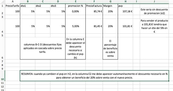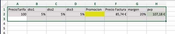 Preciotarifa(1-dto1)(1-dto2)(1-dto3)(1-prom) = pvp(1-margen)