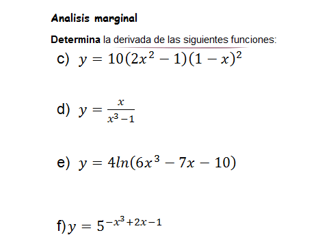 $$\begin{align}&y=10(2x^2-1)(1-x)^2\\&\\&y'=10\left(4x(1-x)^2+(2x^2-1)·2(1-x)(-1) \right)\\&\\&y'=10\left(4x(1-2x+x^2)-2(2x^2-1)(1-x)\right)\\&\\&y'=10\left(4x-8x^2+4x^3-4x^2+4x^3+2-2x \right)\\&\\&y'=10\left(8x^3-12x^2+2x+2 \right)\\&\\&\text {y aqui puedes optar por dos caminos}\\&\\&y'=20(4x^3-6x^2+x+1)\\&\\&o\\&\\&y'=80x^3-120x^2+20x+20\end{align}$$d)