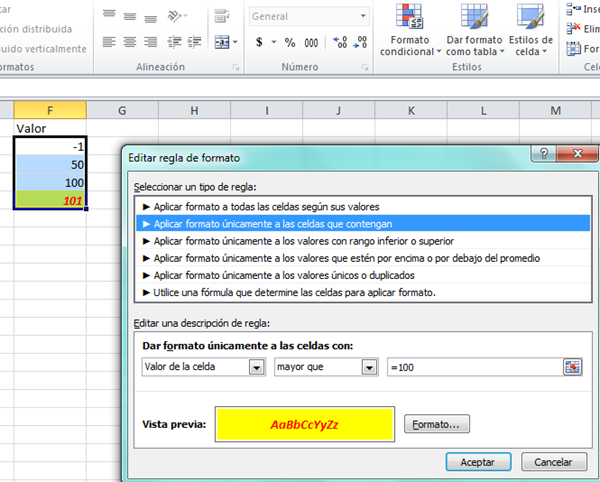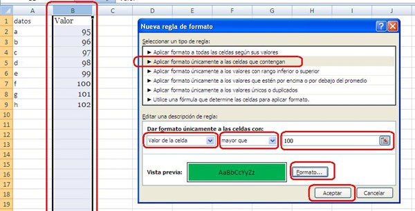 En una lista tengo valores y quiero poner de un color los que son mayores a 100, Mi pregunta, ¿con cuál fórmula cambio de color una celda si su valor es mayor a 100?
