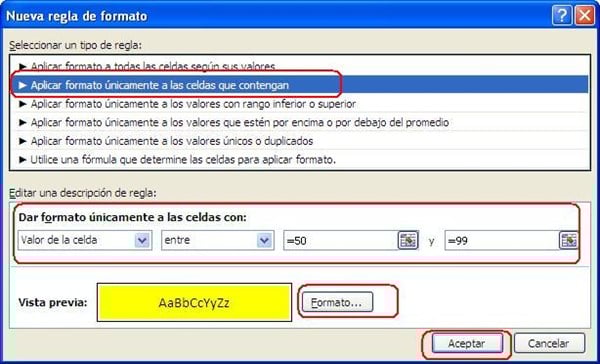 Poner de color amarillo todas las celdas que su resultado sea Falta