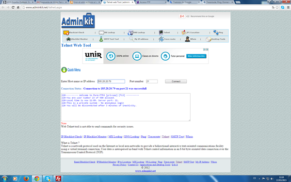 Pones la IP de tu servidor FTP y el puerto 21. Debe salir un mensaje como este: