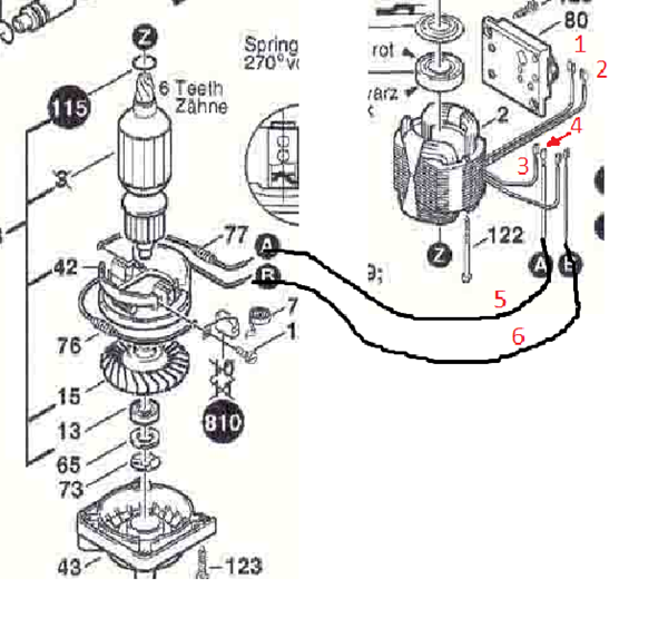 Ya con tensión de red ( o mejor menor-( un 50%) a través de un transformador) conectas ( térmica de por medio) todo y observas que pasa... el motor( que debe estar bien sostenido) te comenzara a girar rápidamente... Fíjate el sentido de giro ... si es el correcto para la herramienta...Si no lo es inviertes los cables 5 y 6 del rotor... y te invetira el sentido de giro.