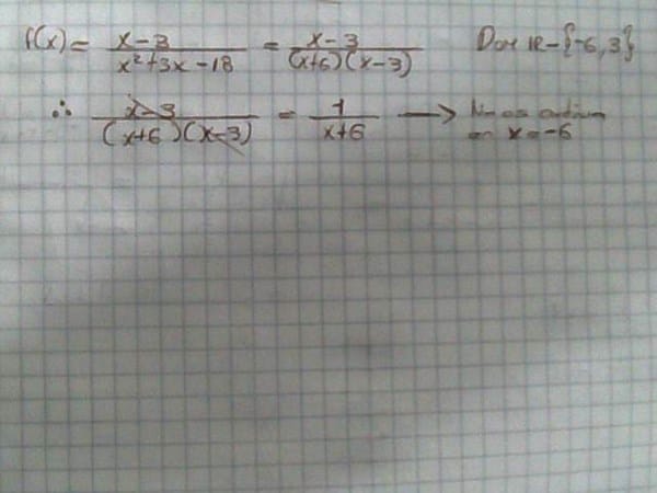Bueno, en el libro dice que esta función no es continua en -6 y en 3, pero si la función se factoriza y se define como 1/x+6, entonces no es continua solamente en -6, ¿entonces por qué en el libro dice que la función no es continua también en 3?