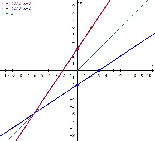 $$\begin{align}&y=F(x)\\&\\&y=\frac{3}{2}x+3\\&\\&y-3= \frac 32 x\\&\\&\frac 32x= y-3\\&\\&x=\frac 23(y-3)\\&\\&x=\frac 23y -2\\&\\&\text{ahora cambiamos los papeles}\\&\\&y =\frac 23x-2\\&\\&\text{o prodríamos haber puesto directamente}\\&\\&F^{-1}(x) = \frac 23x-2\\&\end{align}$$Y siendo dos rectas no hay ningún problema para dibujarlas, calculas dos puntos de cada una