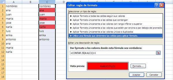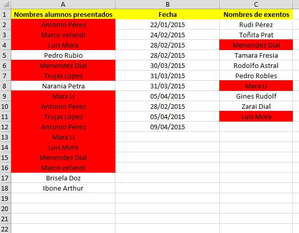 Estoy buscando la manera de asignar un Formato Condicional para aplicar a las celdas de la columna A de forma que cuando yo introduzca en alguna celda de esta columna el nombre de un niño y este nombre ya esté apuntado en alguna de las celdas de la columna B se me ponga el fondo de color rojo en la celda de la columna A, (pretendo que me indique de esta manera que este nombre ya figura en el listado de la columna B).
