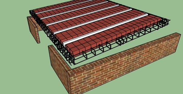 Efectivamente, si fuera un cuadrado la planta, en el lado superior se sujetará en un muro de un pie, en el lado de la derecha del cuadrado se sujetará en otro muro de un pie, en la esquina inferior izquierda se sujetará en un pilar? Del muro de la derecha al pilar pondré una viga de tres metros y desde el muro del lado superior hasta la viga anterior llevará seis viguetas de hierro a 60 cm, poniendo la primera en el muro de la derecha y cargando los demás en la viga.