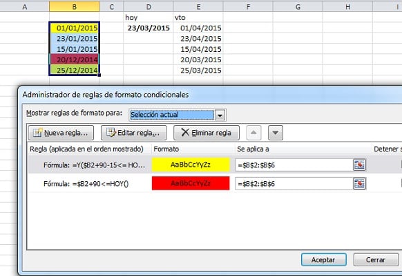 El próximo control he de hacerlo no más tarde del 1-4-2015. Quiero que 15 días antes de la fecha del proximo control la celda donde esta puesto 1-1-15 se ponga amarilla. Y cuando llegue el 1-4-15 se ponga roja.