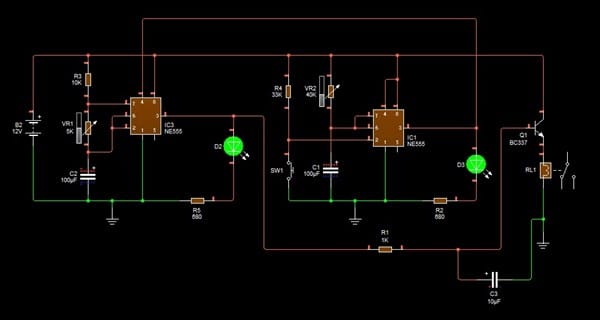 Este es el circuito que diseñe por las características de lo que necesito. Al presionar el pulsador el 555 de la izq. Dispara tres veces (así debe ser), el de la derecha mantiene por ese tiempo el relay activo, luego se apaga, pero si vuelvo a presionar, todo vuelve, y es lo que no debe suceder. Desde ya muchas gracias por sus ideas, sugerencias o sólo saludos. Julio