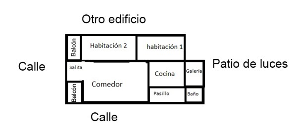 En la parte interna del piso, cocina, galería, baño, pasillo y una habitación da al patio de luces, donde sí se comunica con los otros vecinos, pero comedor, salita y habitación de matrimonio da a la calle.