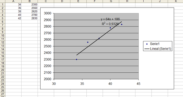 Es correcto que para hallar la pendiente puedo escoger dos puntos cualquiera, por ejemplo: A(36, 2560) y B(40, 2780) y con la fòrmula: