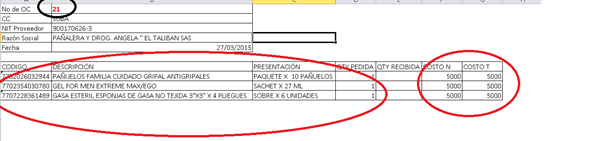 3. Ahora tengo una tercer hoja llamada Generación de entradas en la cual pretendo que al introducir el No de la OC, la macro busque entre los registros del punto 2 y traiga todos los datos de la OC, algo como la siguiente imagen, teniendo en cuenta que lo encerrado en circulo rojo lo pegue como valores para ilustrarlo como ejemplo y es como quisiera el resultado,: