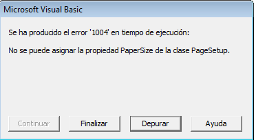 Sub Macro3() ' ' Macro3 Macro ' ' Range("AA1:AB13").Select Application.PrintCommunication = True With ActiveSheet.PageSetup .PrintTitleRows = "" .PrintTitleColumns = "" End With 'ActiveSheet.PageSetup.PrintArea = "" With ActiveSheet.PageSetup .LeftHeader = "" .CenterHeader = "" .RightHeader = "" .LeftFooter = "" .CenterFooter = "" .RightFooter = "" .LeftMargin = Application.InchesToPoints(0.236220472440945) .RightMargin = Application.InchesToPoints(0.236220472440945) .TopMargin = Application.InchesToPoints(0.236220472440945) .BottomMargin = Application.InchesToPoints(0.236220472440945) .HeaderMargin = Application.InchesToPoints(0) .FooterMargin = Application.InchesToPoints(0) .PrintHeadings = False .PrintGridlines = False .PrintComments = xlPrintNoComments .PrintQuality = 203 .CenterHorizontally = False .CenterVertically = False .Orientation = xlPortrait .Draft = False .PaperSize = 217 ' Donde se genera el error............... .FirstPageNumber = xlAutomatic .Order = xlDownThenOver .BlackAndWhite = False .Zoom = 100 .PrintErrors = xlPrintErrorsDisplayed .OddAndEvenPagesHeaderFooter = False .DifferentFirstPageHeaderFooter = False .ScaleWithDocHeaderFooter = True .AlignMarginsHeaderFooter = True .EvenPage.LeftHeader.Text = "" .EvenPage.CenterHeader.Text = "" .EvenPage.RightHeader.Text = "" .EvenPage.LeftFooter.Text = "" .EvenPage.CenterFooter.Text = "" .EvenPage.RightFooter.Text = "" .FirstPage.LeftHeader.Text = "" .FirstPage.CenterHeader.Text = "" .FirstPage.RightHeader.Text = "" .FirstPage.LeftFooter.Text = "" .FirstPage.CenterFooter.Text = "" .FirstPage.RightFooter.Text = "" End With 'Application.PrintCommunication = True Selection.PrintOut Copies:=1, Collate:=True End Sub