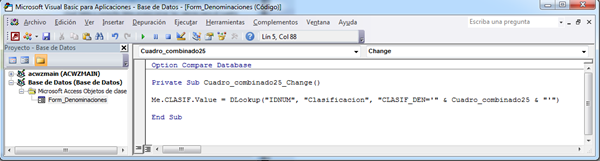 Me.CLASIF.Value = DLookup("IDNUM", "Clasificacion", "CLASIF_DEN='" & Cuadro_combinado25 & "'")
