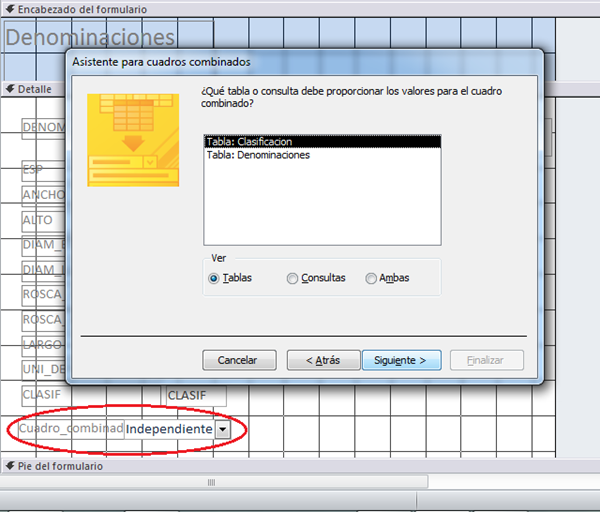 Luego agrego un Cuadro Combinado y le digo que tome los valores del campo CLASIF_DEN de la tabla Clasificación.