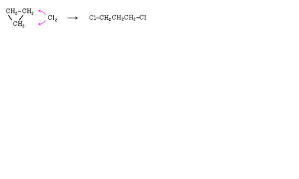 Espero me puedan ayudar. Mi pregunta es acerca del mecanismo de cloración del ciclopropano. Por ser el ciclopropano un anillo con gran tensión, sufre una apertura del anillo al adicionarse el Cl2 para formar ClCH2CH2CH2Cl... Mi duda es la forma o mecanismo exacto en la que ocurre esta apertura.