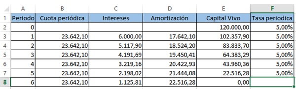 Se introducen los datos del capital inicial en E2 y de la tasa periódica en F2. La columna F debe tener el formato de tanto por ciento. Este valor se copia desde F3 hasta F7. Lo he hecho así por si la tasa no fuese fija para poder poner tasas distintas