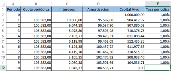 4.-Lanasa, empresa constructora tiene una deuda de $1,000,000.00 a pagar en un única exhibición dentro de 10 meses, pero desea hacer 10 pagos mensuales iguales a fin de mes. ¿Cuál es el valor del pago mensual si la tasa de interés mensual es del 1%? Elabora la tabla de amortización
