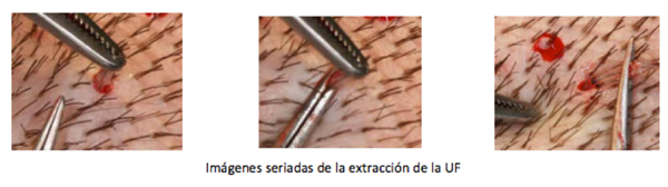 El cirujano después de decidir las mejores áreas para conseguir los injertos de una forma individual, no traumática y limpia comienza la extracción. Nunca se fuerza la salida del injerto del interior de la epidermis; siguiendo la dirección del pelo el injerto sale con facilidad.