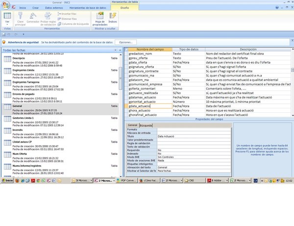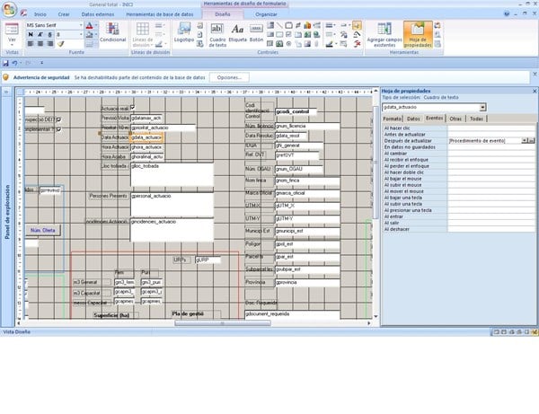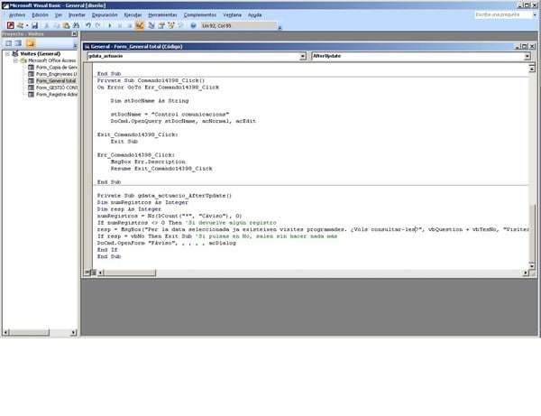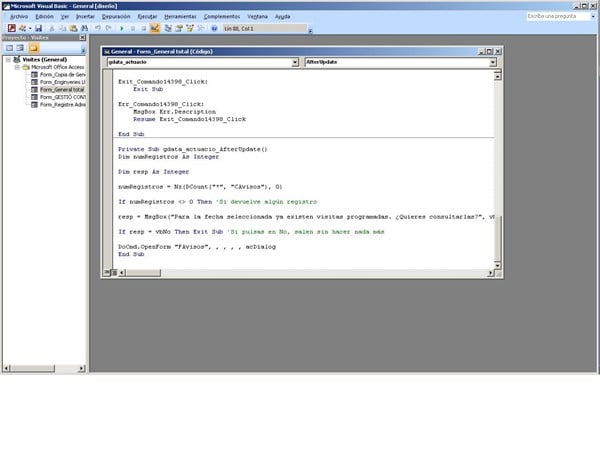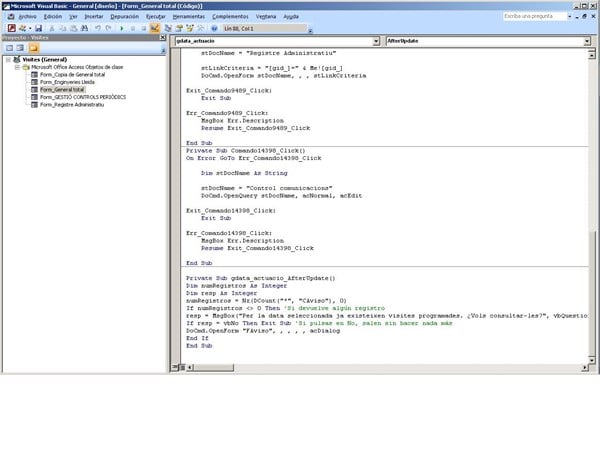 2º/ Abre el formulario General total en vista diseño, selecciona el campo gdata_actuacio, saca sus propiedades con el botón derecho, vete a la pestaña Eventos y localiza el que se llama "después de actualizar". Verás que a la derecha de esa fila aparece un botón con 3 puntos. Lo pulsas y seleccionas "Generador de código". Se te abrirá el editor de VBA, y entre las lineas Private Sub... y End Sub (donde te aparece el cursor), pones este código:
