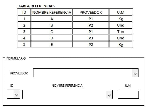A) Tengo la tabla "referencias" con los campos: id, Nombre de Referencia, Proveedor y Unidad de medida.