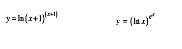 $$\begin{align}&y= ln\left((x+1)^{(x+1)}\right)=(x+1)·ln(x+1)\\&\\&y'=ln(x+1)+(x+1)·\frac{1}{x+1}=\\&\\&ln(x+1)+1\\&\\&\\&------------------\\&\\&y=(ln\,x)^{e^x}\\&\\&\text{tomamos logaritmos neperianos}\\&\\&ln \,y = ln\left((ln\,x)^{e^x} \right)=e^x·ln(ln\,x)\\&\\&\text{derivando en los dos lados}\\&\\&\frac {y'}{y}=e^x·ln(ln(x))+e^x·\frac{1}{ln\,x}·\frac 1x=\\&\\&e^x·ln(ln(x))+\frac{e^x}{x·ln\,x}\\&\\&\text{Y ahora pasamos y a la derecha ya con su valor}\\&\\&y' = \left(e^x·ln(ln(x))+\frac{e^x}{x·ln\,x}\right)·(ln\,x)^{e^x}\\&\\&\text{Y no merece la pena simplificar nada}\end{align}$$Y eso es todo.