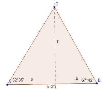 Dos personas se encuentran alejadas entre sí 5 km en una llanura, y un cierto instante, un globo aerostático atraviesa entre ambos. Cada individuo mide el ángulo de elevación con el que ve el globo y resulta 52 grados 35 min y 67 grados y 42 min respectivamente. Halle la elevación del globo en ese instante y la distancia del globo a cada observador.