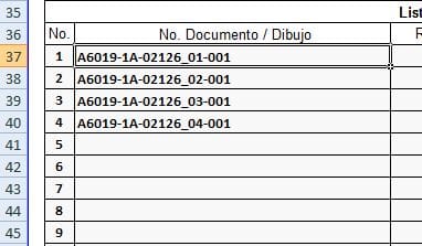 A partir de la 3ra. Hoja son exactamente el mismo formato, pero en cada una agregan información diferente, entre lo que me interesa esta esta nomenclatura ( A6019-1A-02126_01-001 ) esta información siempre se encuentra desde la celda C37 hasta la celda C51, y lo que me interesa de esta información en particular es el apartado " 1A ",