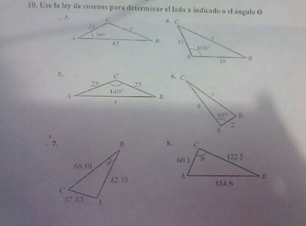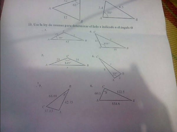 $$\begin{align}&a=\sqrt{b^2+c^2-2bc\,cosA}\\&\\&a=\sqrt{21^2+42^2-2·21·42·\cos 39º}= 28.88104\\&\\&\text{Y ahora hay que aplicar el de los senos}\\&\text{Pondré el termino que se puede operar el último}\\&\\&\frac{21}{sen \,B}= \frac{42}{senC}=\frac{28.88104}{sen\,39º}= 45.892427\\&\\&sen\;B= \frac{21}{45.892427}=0.4575918\implies\\&\\&B=sen^{-1}(0.4575918) = 27.23º\\&\\&senC=\frac{42}{45.892427}= 0.91518\\&\\&C=sen^{-1}(0.91518)= 66.2318º \;y\;113.7682º\end{align}$$Bueno, puedes ver que este ejercicio tiene algo raro, la calculadora solo ha dado el primer ángulo, pero me he dado cuenta de que en los tres no suman 180º. Entonces debes tener en cuenta que los ángulos alfa y 180º-alfa tienen el mismo seno, por eso he calculado el segundo haciendo esa operación.