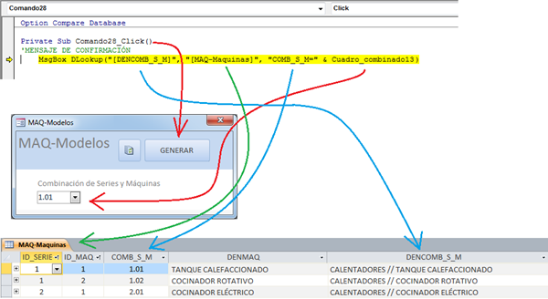 Tengo una tabla con unos cuantos campos y desde un formulario pretendo mediante un cuadro combinado seleccionar un valor de uno de los campos de la tabla. Luego, al dar click en un botón del formulario, desearía que éste me devolviera por medio de una MsgBox el valor de un campo vecino (misma fila) al valor que seleccioné con el cuadro combinado.