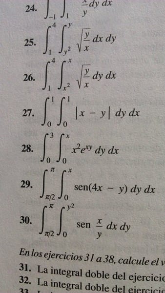 $$\begin{align}&\int_0^3\int_0^x(x^{2}e^{xy})dydx\\&\\&Resolveremos\ primero \ la\ integral:\\&\\&\int_0^x(x^{2}e^{xy})dy, Entonces:\\&\\&\int_0^x(x^{2}e^{xy})dy= x^{2}\int_0^x(e^{xy})dy, Podemos\ sacar\ la\ x^{2} \ porque \ estamos\ derivando\ con \ respecto \ de\ y\\& \ \ \ \ \ \ \ \ \ \ \ \ \ \ \ \ \ \ \ \ \ \ \ \ = x^{2}\int_0^x(e^{xy})dy, Hacemos\ cambio\ de \ variable\ asi:\ sea\ u=xy, entonces\ du/x=dy\ y\ sustituimos\ esto\ en\ la \ integral\\& \ \ \ \ \ \ \ \ \ \ \ \ \ \ \ \ \ \ \ \ \ \ \ \ = x^{2}\int_0^x(e^{u})du/x\\& \ \ \ \ \ \ \ \ \ \ \ \ \ \ \ \ \ \ \ \ \ \ \ \ = x\int_0^x(e^{u})du\\& \ \ \ \ \ \ \ \ \ \ \ \ \ \ \ \ \ \ \ \ \ \ \ \ = x(e^{xy})de\ 0\ a\ x\\&\ \ \ \ \ \ \ \ \ \ \ \ \ \ \ \ \ \ \ \ \ \ \ \ = x(e^{x^{2}}-1)\\&\\&Y \ solo\ resta\ resolver\ la \ integral\ pendiente:\\&\int_0^3 x(e^{x^{2}}-1)dx= \int_0^3 xe^{x^{2}}dx-\int_0^3 xdx,Esto\ por\ propiedades\ de\ la\ integral\\&\ \ \ \ \ \ \ \ \ \ \ \ \ \ \ \ \ \ \ \ \ \ \ \ \ \ \ \ \ = \int_0^3 xe^{x^{2}}dx-9/2, volvemos\ a\ hacer\ cambio\ de\ variable\ entonces\ sea\ u=x^{2} entonces\ eso\ significa\ que\ du=2xdx\\&\ \ \ \ \ \ \ \ \ \ \ \ \ \ \ \ \ \ \ \ \ \ \ \ \ \ \ \ \ =\int_0^3 e^{u}dx/2-9/2\\&\ \ \ \ \ \ \ \ \ \ \ \ \ \ \ \ \ \ \ \ \ \ \ \ \ \ \ \ \ =1/2\int_0^3 e^{u}dx-9/2\\&\ \ \ \ \ \ \ \ \ \ \ \ \ \ \ \ \ \ \ \ \ \ \ \ \ \ \ \ \ =(1/2(e^{x^{2}})de\ 0\ a\ 3)-9/2\\&\ \ \ \ \ \ \ \ \ \ \ \ \ \ \ \ \ \ \ \ \ \ \ \ \ \ \ \ \ =(1/2)e^9-(1/2)-(9/2)\\&\ \ \ \ \ \ \ \ \ \ \ \ \ \ \ \ \ \ \ \ \ \ \ \ \ \ \ \ \ =(e^9/2)-5\\&\\&\\&\\&\end{align}$$y ése es el valor de ése ejercicio.
