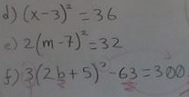 $$\begin{align}&d) (x-3)^2=36\\&\\&(x-3)^2=36 -->Quitas-la- raíz- de- la- 1a-parte\\&\\&x-3=\sqrt(36)\\&\\&x-3=6\\&\\&x=6+3=9\\&------------\\&e) 2(m-7)^2=32\\&\\&2(m-7)^2=32 ->Pasas-el-2-dividiendo-al-otro-lado\\&(m-7)^2=16 -->Quitas-la- raíz- de- la- 1a-parte\\&(m-7)=\sqrt(16) -->La-raíz-puede-tener-2-soluciones\\&\\&Solución 1\\&m-7=4\\&m=4+7=11\\&\\&Solución 2\\&m-7=-4\\&m=3\\&\\&f) 3(2b+5)^2-63=300\\&3(2b+5)^2-63=300 --> 1º Pasamos-el-63-al-otro-lado\\&3(2b+5)^2=363 -->2º-Pasamos-el-3-dividiendo-al-otro-lado\\&(2b+5)^2=121 -->Deshacemos-la-raíz.Tenemos-2-soluciones\\&\\&2b+5=11\\&2b=11-5\\&2b=6\\&b=6/2=3\\&\\&2b+5=-11\\&2b=-11-5\\&2b=-16\\&b=-16/2=-8\\&\\&\\&\\&\\&\\&\end{align}$$