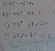 $$\begin{align}&g)\\&\\&n^2+n=0\\&\\&n(n+1)=0\\&\\&n=0\\&n+1=0\implies n=-1\\&\\&\text{Luego las respuestas son }\\&n_1=0, \quad n_2=-1\\&\\&\\&h) -4x^2-8x=0\\&\\&-4x(x+2)=0\\&\\&x=0\\&x+2=0 \implies x=-2\\&\\&\text{Luego las respuestas son }\\&x_1=0,\quad x_2=-2\\&\\&\\&i)\\&\\&7x^2-21x=0\\&\\&7x(x-3) =0 \\&\\&x=\\&x-3=0\implies x=3\\&\\&\text{las soluciones son}\\&x_1=0,\quad x_2=3\\&\\&\\&j)\\&\\&33b^2-44b=0\\&\\&11b(3b-4)=0\\&\\&b=0\\&3b-4=0\implies 3b=4\implies b=\frac{4}{3}\\&\\&\text{luego las respuestas son}\\&\\&b_1=0,\quad b_2=\frac 43\\&\\&\end{align}$$A mi no me gusta nada poner respuestas no exactas, es mejor dejar el número fraccionario. Pero si tu profesor lo tiene costumbre pon b_2 = 1.333333...