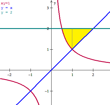 Esos límites fijos de y son por una parte el 2 de la recta y=2 y por otra el punto de corte de la recta y=x con la hipérbola xy=1