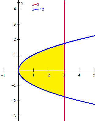 Trasladaremos la recta x=3 a la recta x=0, de esta forma el problema es el de girar una curva alrededor del eje Y que es algo que sabemos hacer. Esta traslación consiste en restar 3 a las coordenada x, por ello queda que la recta x=3 se queda en x=0, y la parábola x=y^2 quedará en